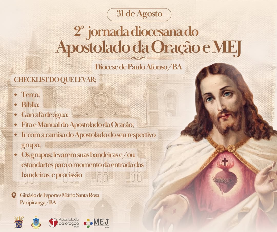 É com imensa alegria que convidamos você para participar da nossa 2ª Jornada Diocesana do Apostolado da Oração e do Movimento Eucarístico Jovem (MEJ)!