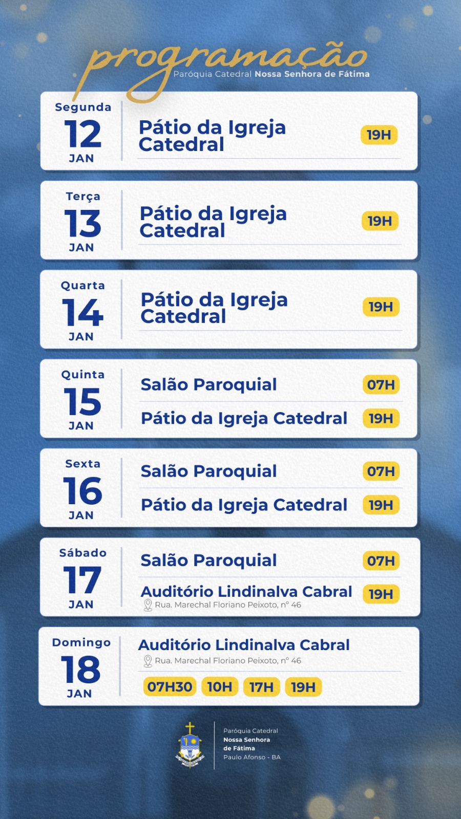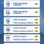 Para assegurar a continuidade da vida pastoral da paróquia, as missas serão realizadas em locais alternativos, conforme a programação previamente divulgada. Entre os espaços utilizados estão o Pátio da Igreja Catedral, o Salão Paroquial e o Auditório Lindinalva Cabral, respeitando os dias e horários específicos de cada celebração.