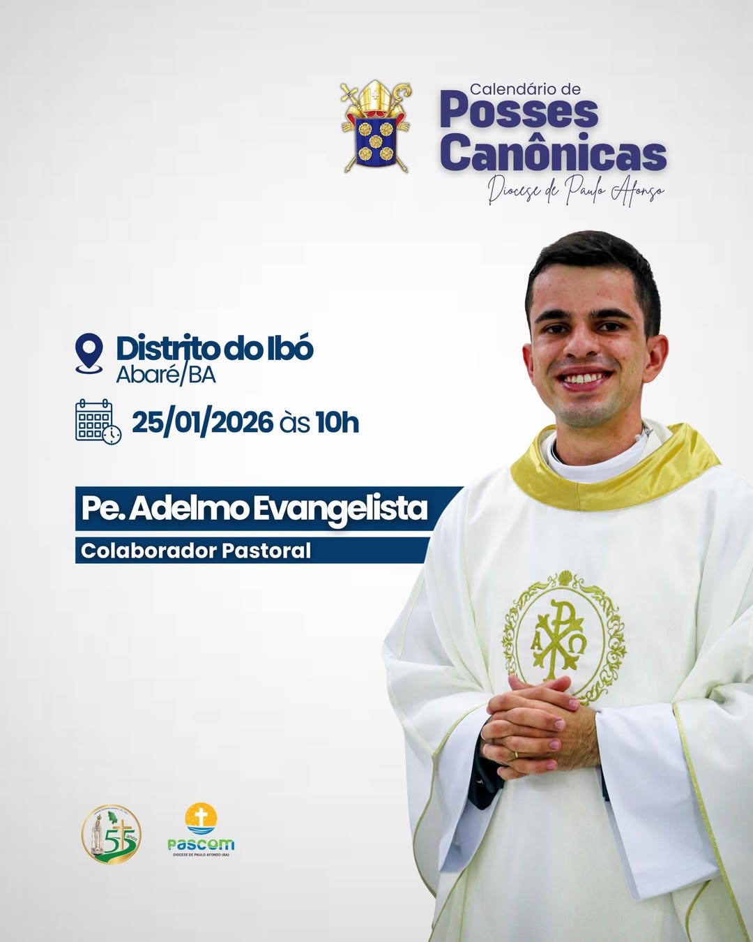 1. Pe. Adelmo Evangelista dos Reis: Posse dia 25 de janeiro de 2026 às 10h, no Distrito de Ibó em Abaré;