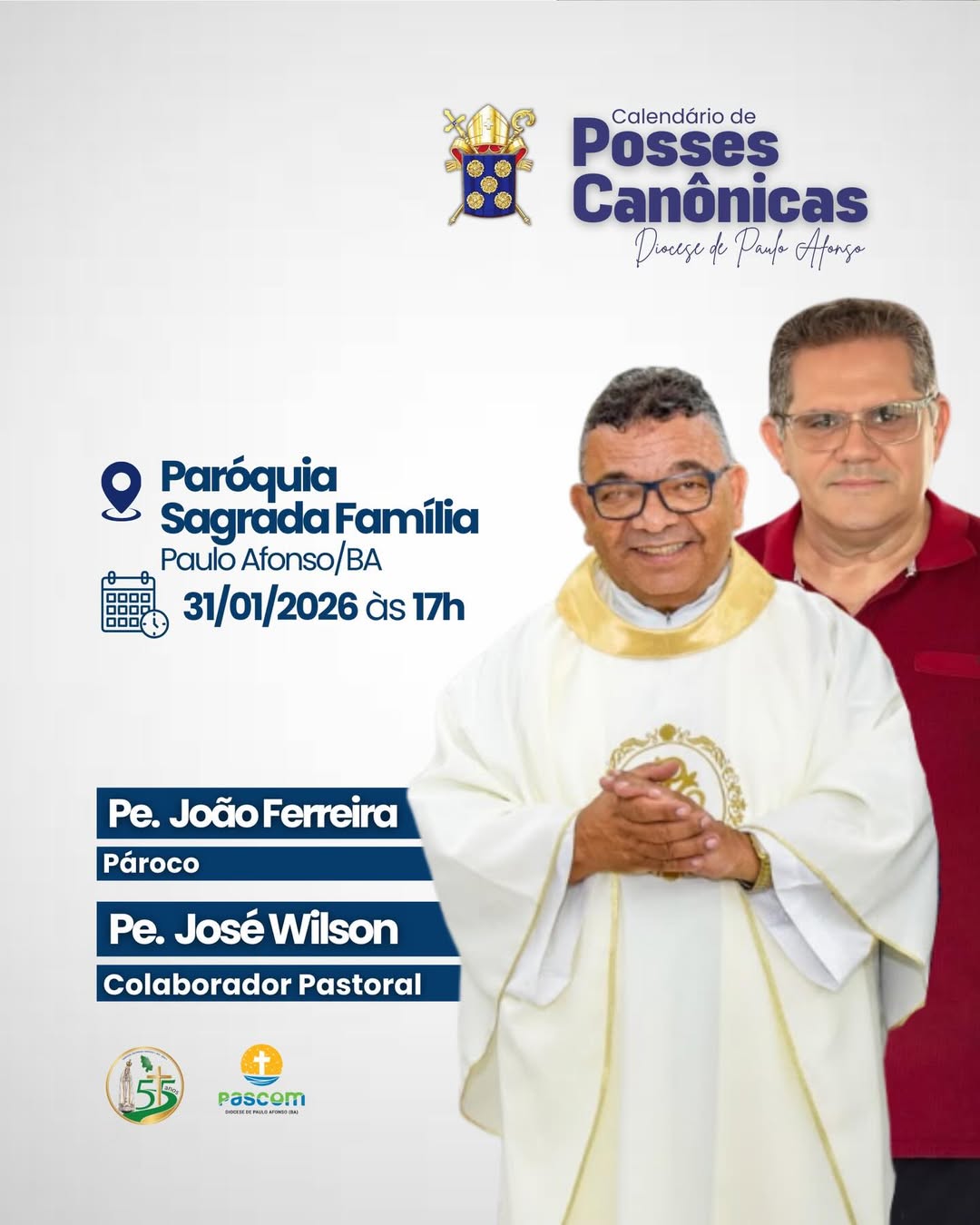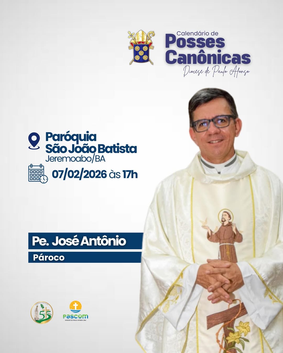 2. Pe. João Batista Ferreira: Posse dia 31 de janeiro de 2026 às 17h na Paróquia Sagrada Família, BTN em Paulo Afonso.