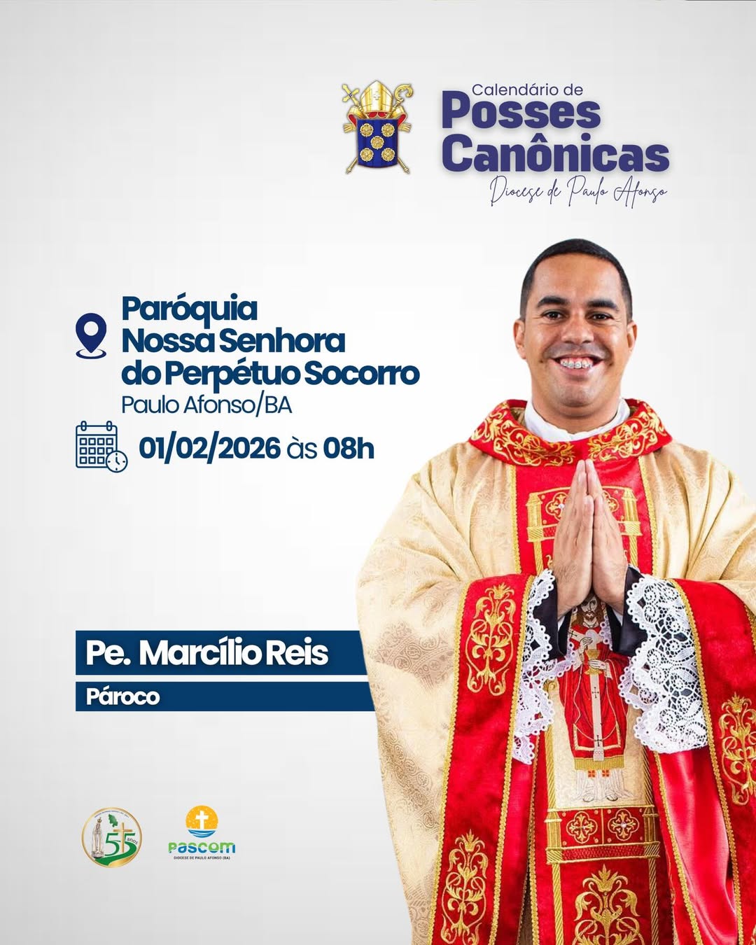 4. Pe. Marcílio Reis dos Santos: Posse dia 1º de fevereiro de 2026 às 08h na Paróquia N. Srª do Perpétuo Socorro em Paulo Afonso.