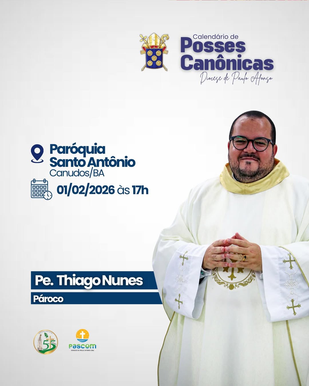 5. Pe. Thiago Nunes da Silva: Posse dia 1º de fevereiro de 2026 às 17h na Paróquia Santo Antônio em Canudos.