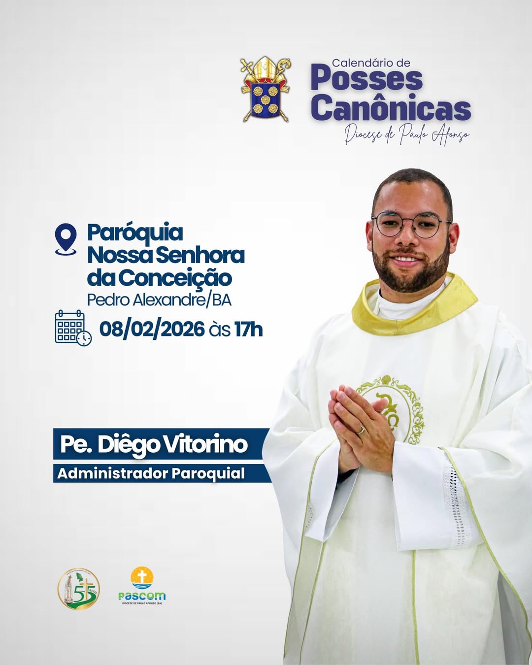 10. Pe. Diego Vitorino da Silva– Posse dia 08 de fevereiro de 2026 às 17h, na Paróquia N. Srª da Conceição em Pedro Alexandre;