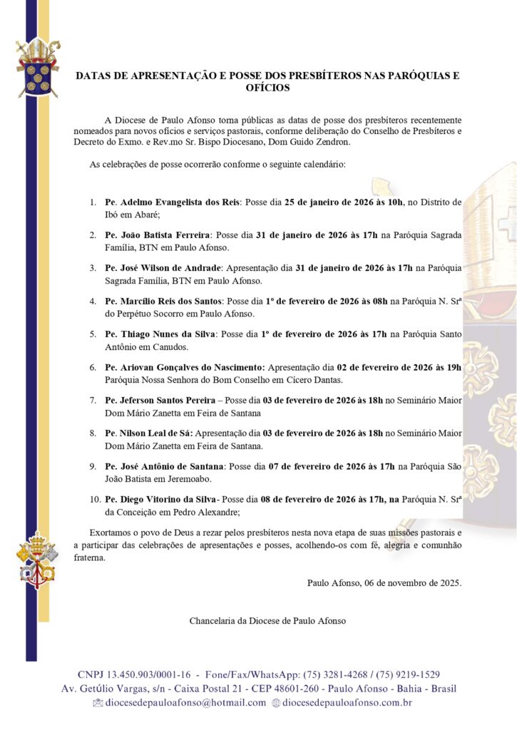 A Diocese de Paulo Afonso torna públicas as datas de posse dos presbíteros recentemente nomeados para novos ofícios e serviços pastorais, conforme deliberação do Conselho de Presbíteros e Decreto do Exmo. e Rev.mo Sr. Bispo Diocesano, Dom Guido Zendron.