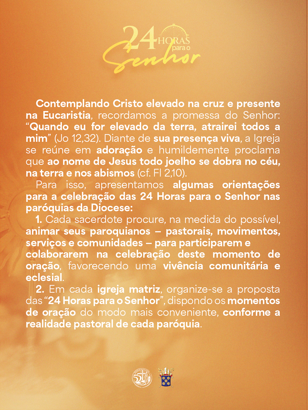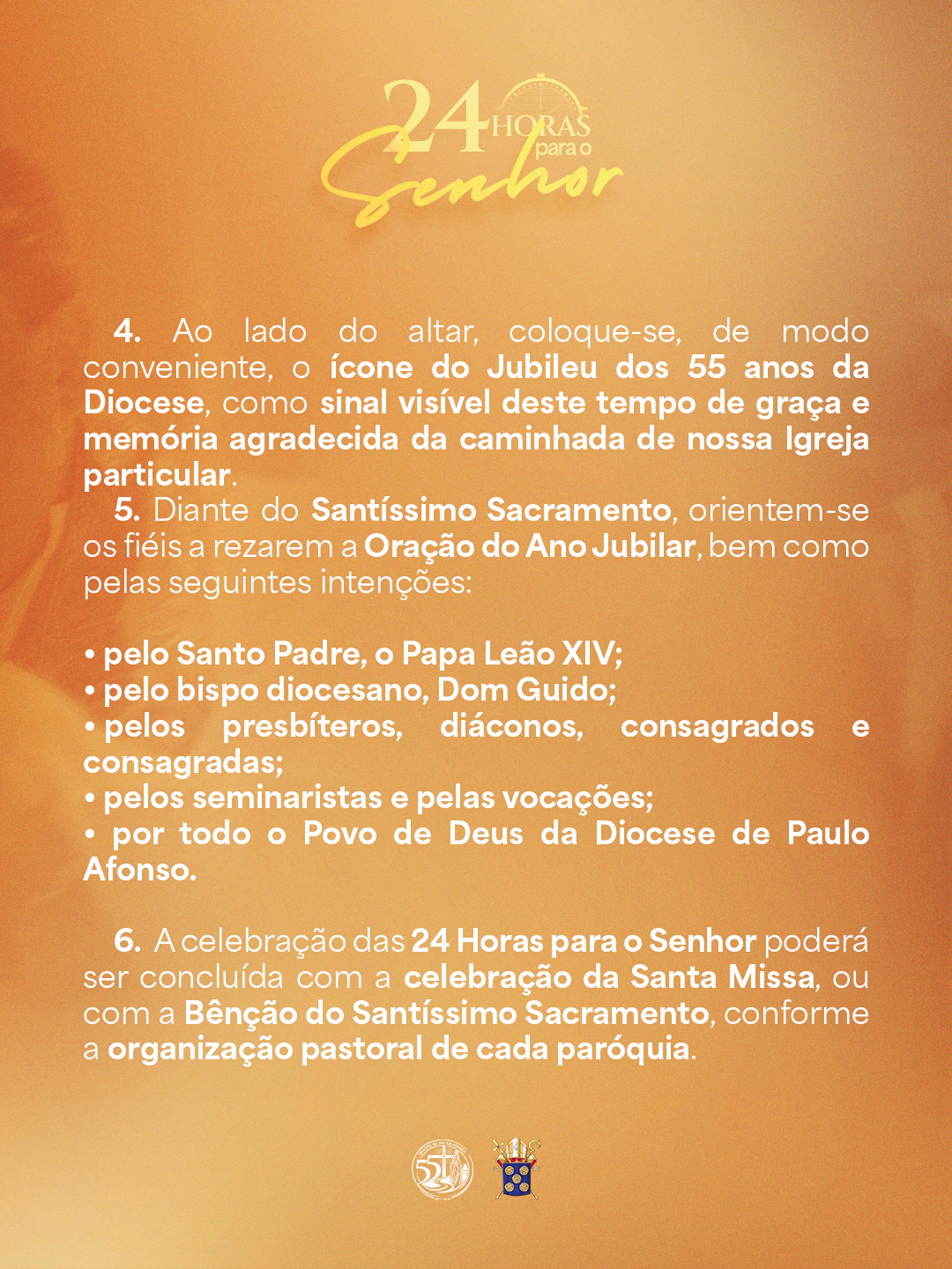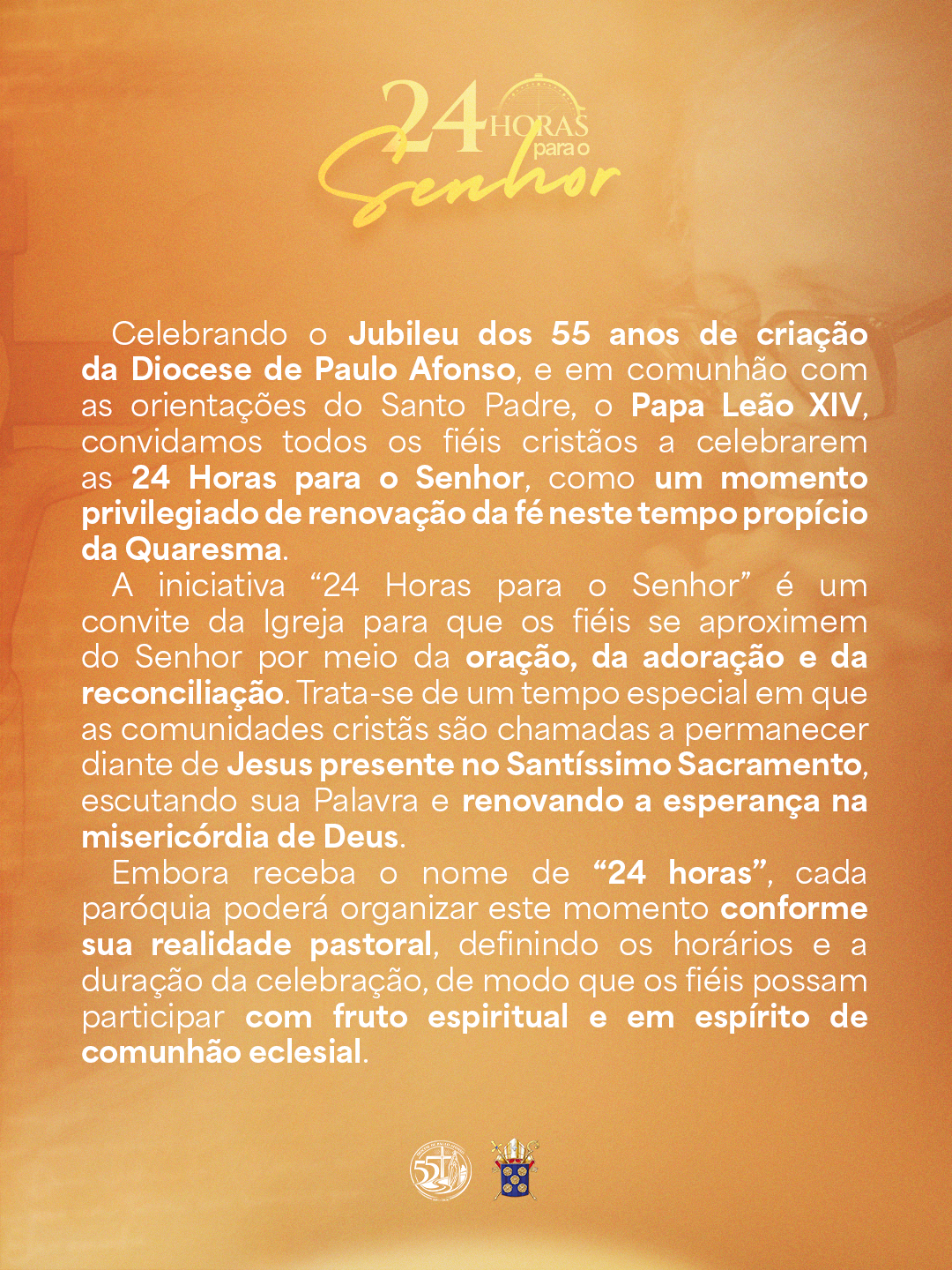 Celebrando o Jubileu dos 55 anos de criação da Diocese de Paulo Afonso, e em comunhão com as orientações do Santo Padre, o Papa Leão XIV, convidamos todos os fiéis cristãos a celebrarem as 24 Horas para o Senhor, como um momento privilegiado de renovação da fé neste tempo propício da Quaresma.