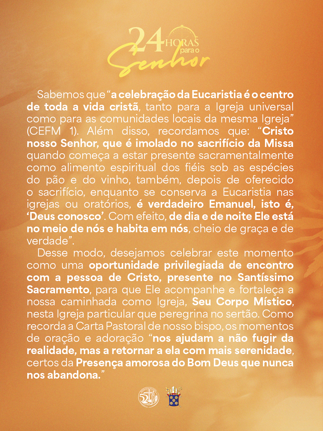 Desse modo, desejamos celebrar este momento como uma oportunidade privilegiada de encontro com a pessoa de Cristo, presente no Santíssimo Sacramento, para que Ele acompanhe e fortaleça a nossa caminhada como Igreja, Seu Corpo Místico, nesta Igreja particular que peregrina no sertão. Como recorda a Carta Pastoral de nosso bispo, os momentos de oração e adoração “nos ajudam a não fugir da realidade, mas a retornar a ela com mais serenidade, certos da Presença amorosa do Bom Deus que nunca nos abandona.”