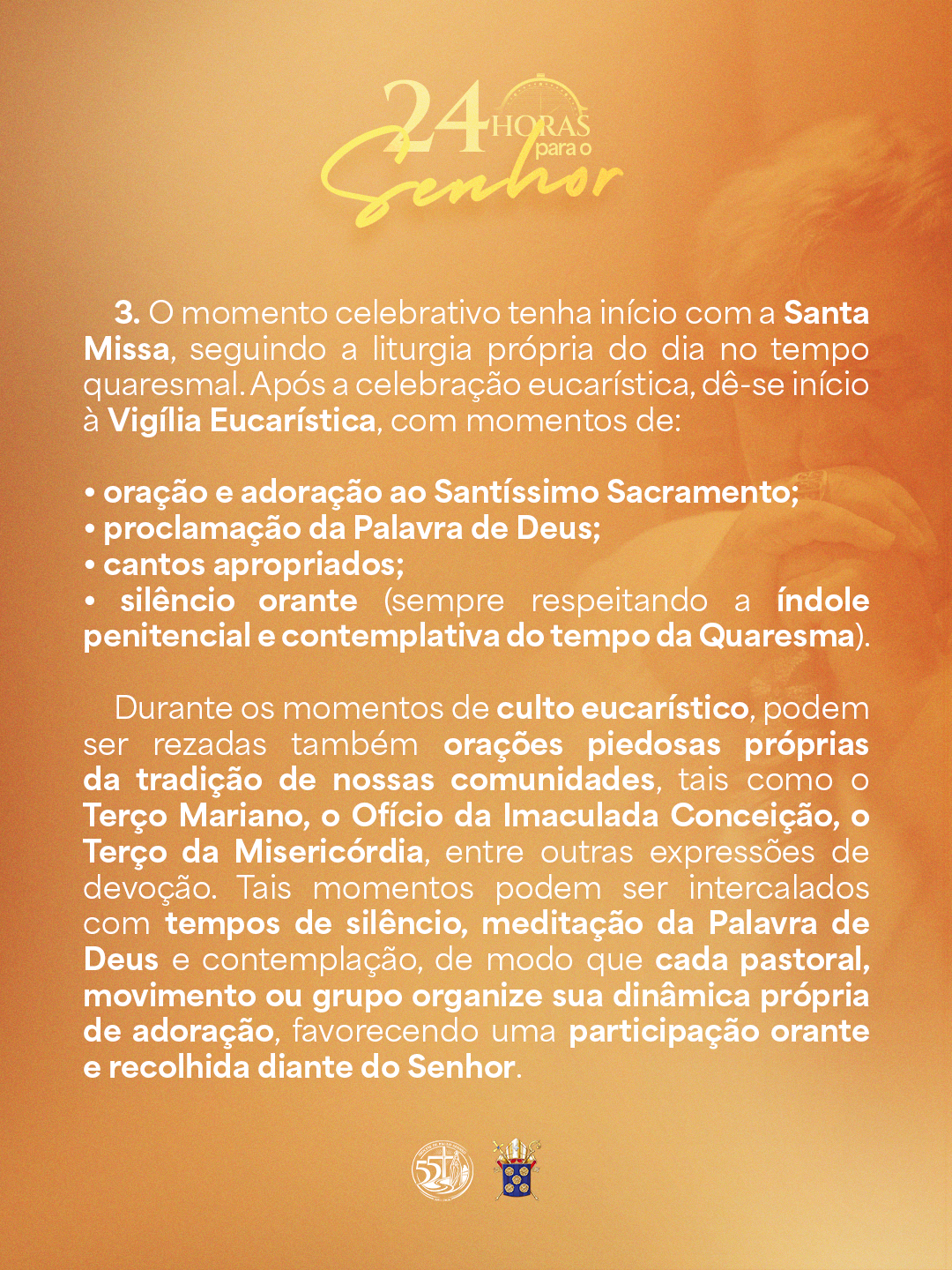 Embora receba o nome de “24 horas”, cada paróquia poderá organizar este momento conforme sua realidade pastoral, definindo os horários e a duração da celebração, de modo que os fiéis possam participar com fruto espiritual e em espírito de comunhão eclesial.