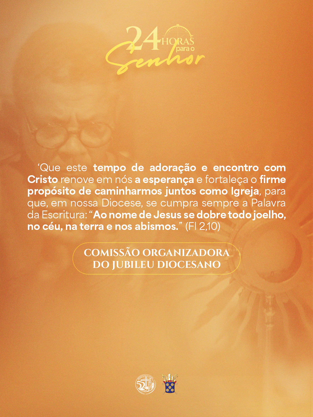 Que este tempo de adoração e encontro com Cristo renove em nós a esperança e fortaleça o firme propósito de caminharmos juntos como Igreja, para que, em nossa Diocese, se cumpra sempre a Palavra da Escritura: “Ao nome de Jesus se dobre todo joelho, no céu, na terra e nos abismos.” (Fl 2,10)