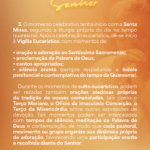 - O momento celebrativo tenha início com a Santa Missa, seguindo a liturgia própria do dia no tempo quaresmal. Após a celebração eucarística, dê-se início à Vigília Eucarística, com momentos de: